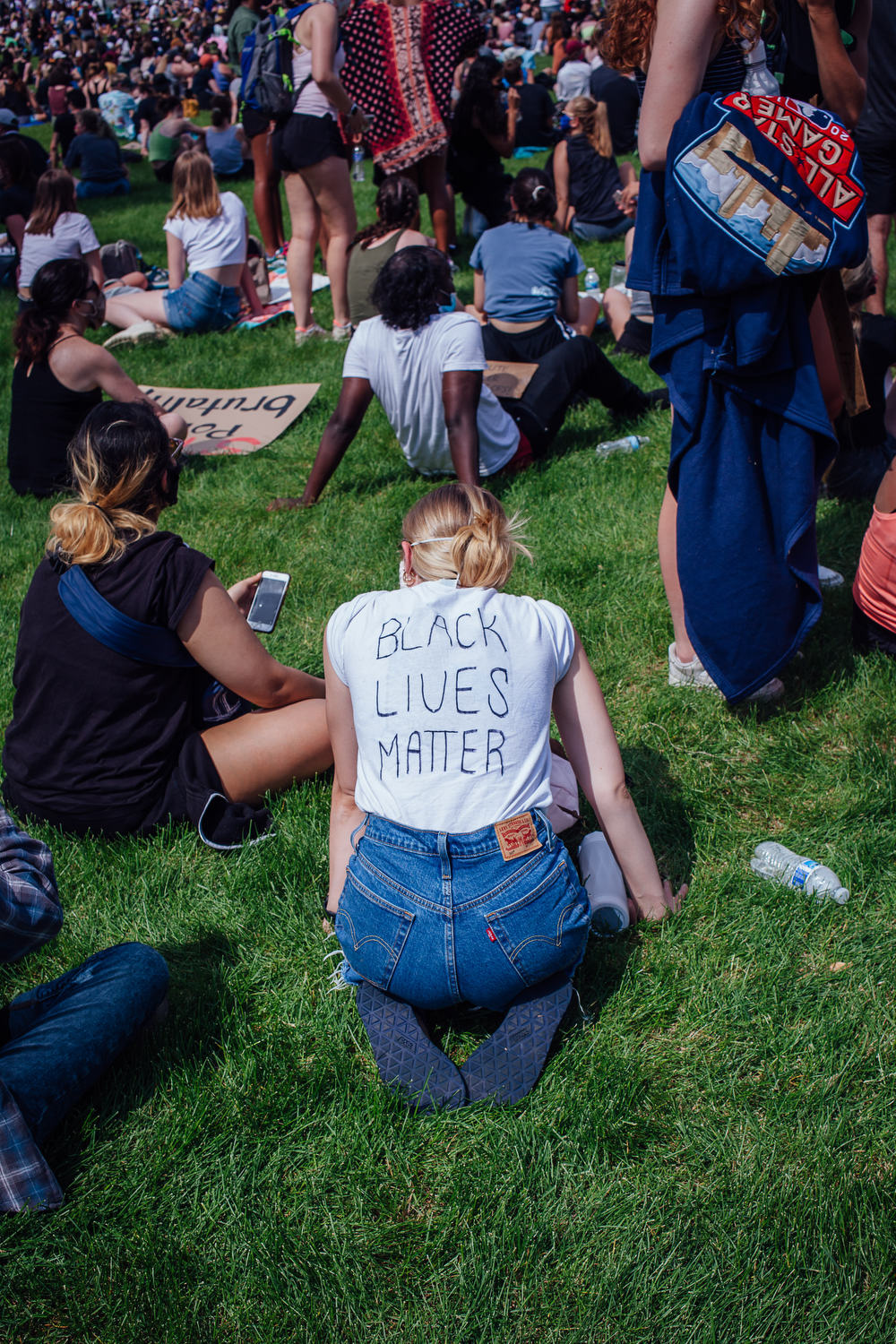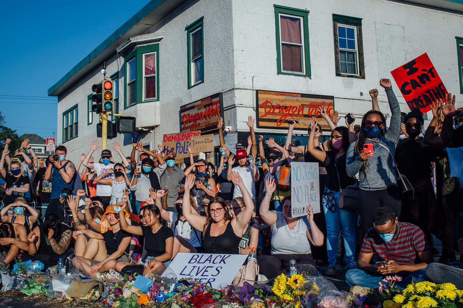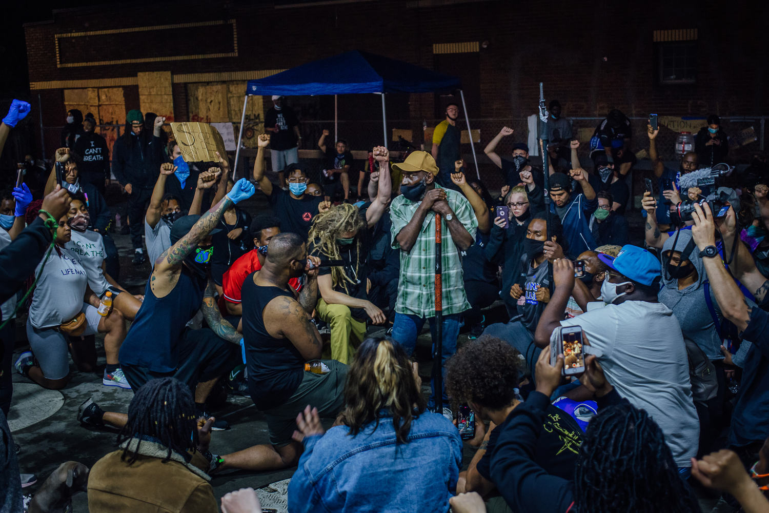Tous s’agenouillent et levent le poing en signe de respect devant le doyen de la foule reunie ce soir la, un homme age de 65 ans, dont le discours a su toucher le coeur de tous. Au coin de la 38eme et de Chicago Avenue, ou George Floyd a ete tue, un memorial improvise est le lieu incessant de reunions, de manifestations de discours. -