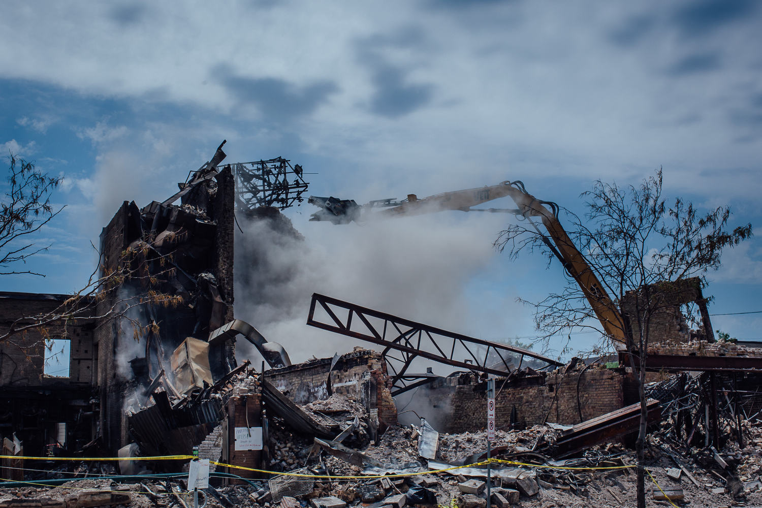 A quelques coins de rue du poste de police ou etait affecte Derek Chauvin, les ruines du restaurant El Nuevo Rodeo, brule lors d’une recente emeute, est mis a terre par une grue. Reportage a Minneapolis, une semaine apres la mort de George Floyd.