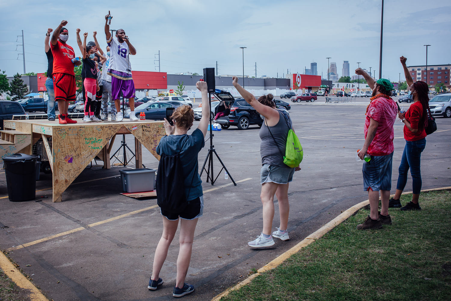 Rassemblement populaire et discours publics au coin de la rue ou Georges Floyd a ete tuee il y a une semaine. -