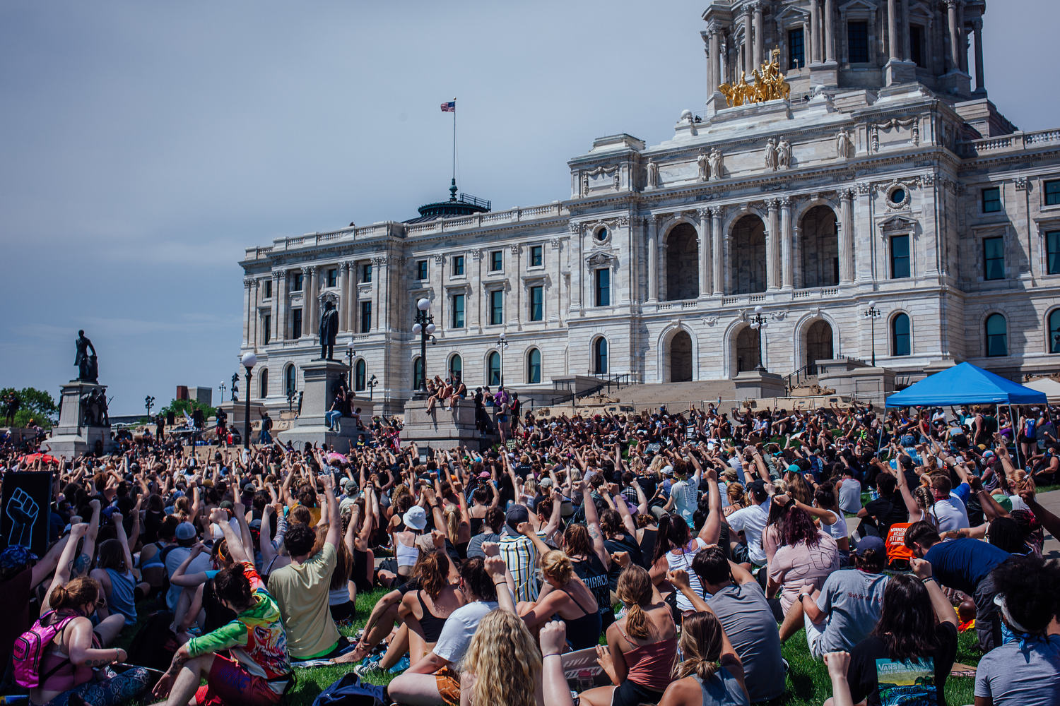 Des milliers de personnes ont pris part a un rassemblement en hommage a George Floyd, face au Capitole de l’Etat du Minnesota, a Saint Paul.