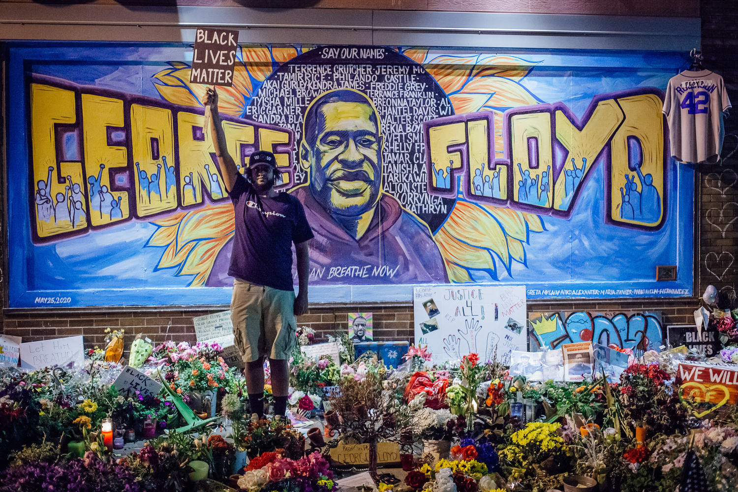 Des dizaines d’oeuvres d’art et des messages de revolte et d’espoir aparaissent et disparaissent sans cesse au memorial a George Floyd, improvise au coin de la 38e rue et de l’avenue Chicago, a Minneapolis, a l’endroit meme ou l’homme noir a trouve la mort. -