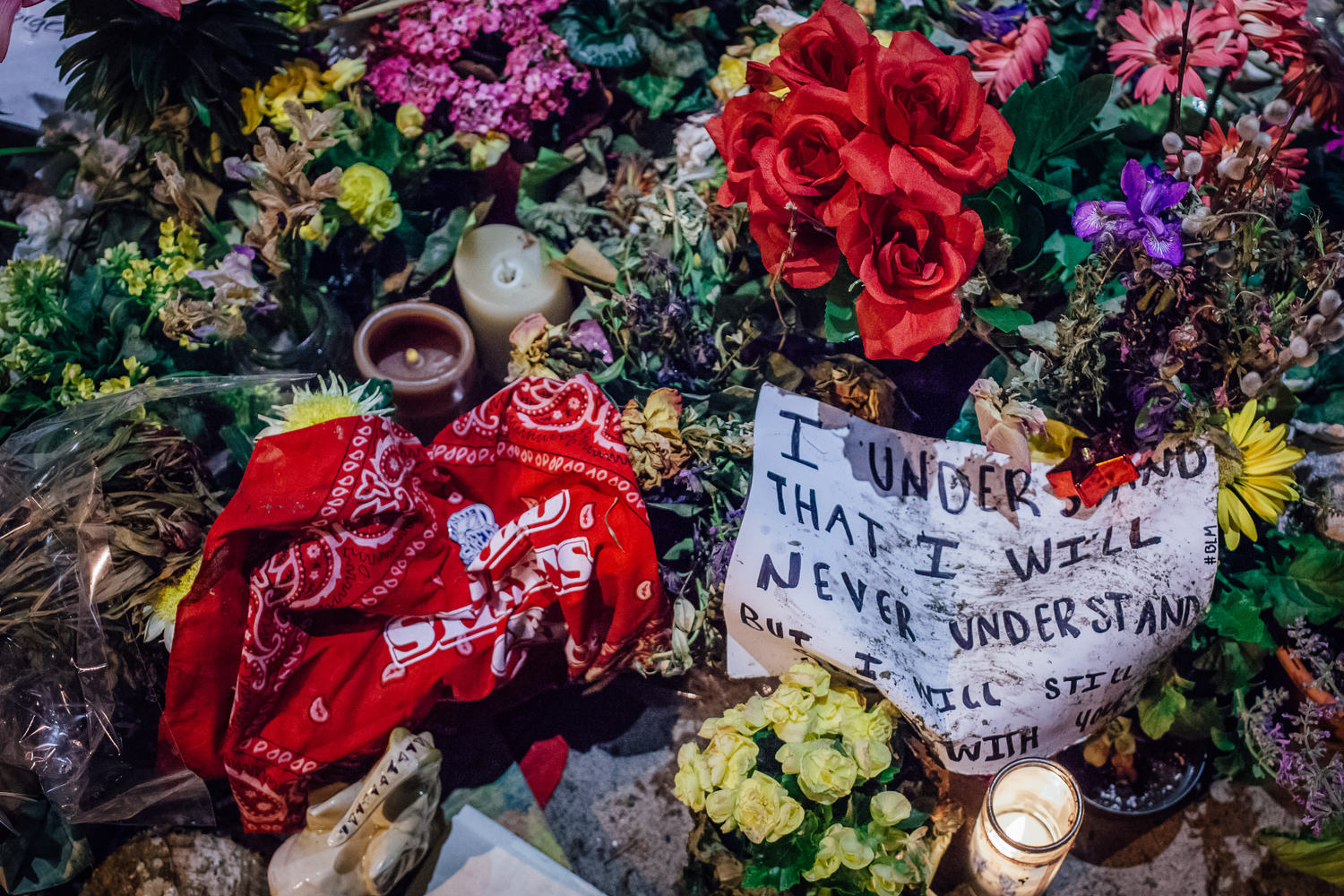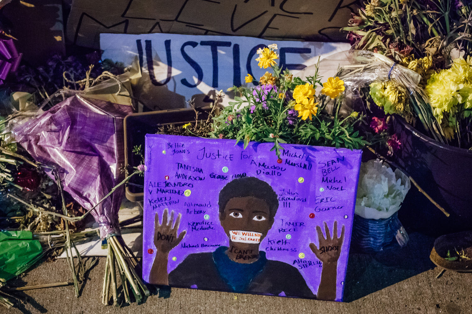 Tous s’agenouillent et levent le poing en signe de respect devant le doyen de la foule reunie ce soir la, un homme age de 65 ans, dont le discours a su toucher le coeur de tous. Au coin de la 38eme et de Chicago Avenue, ou George Floyd a ete tue, un memorial improvise est le lieu incessant de reunions, de manifestations de discours.