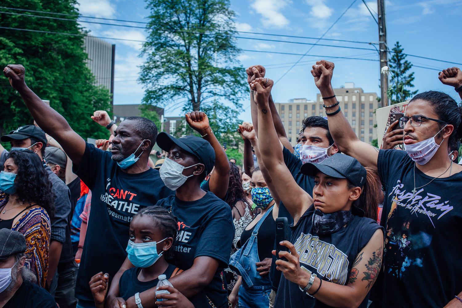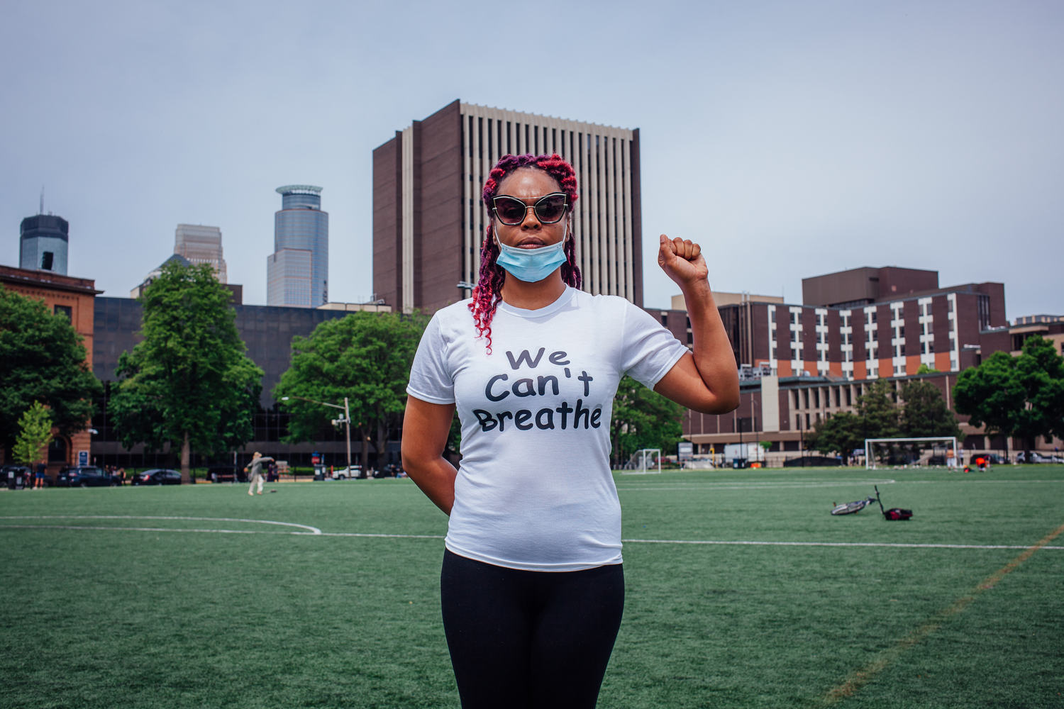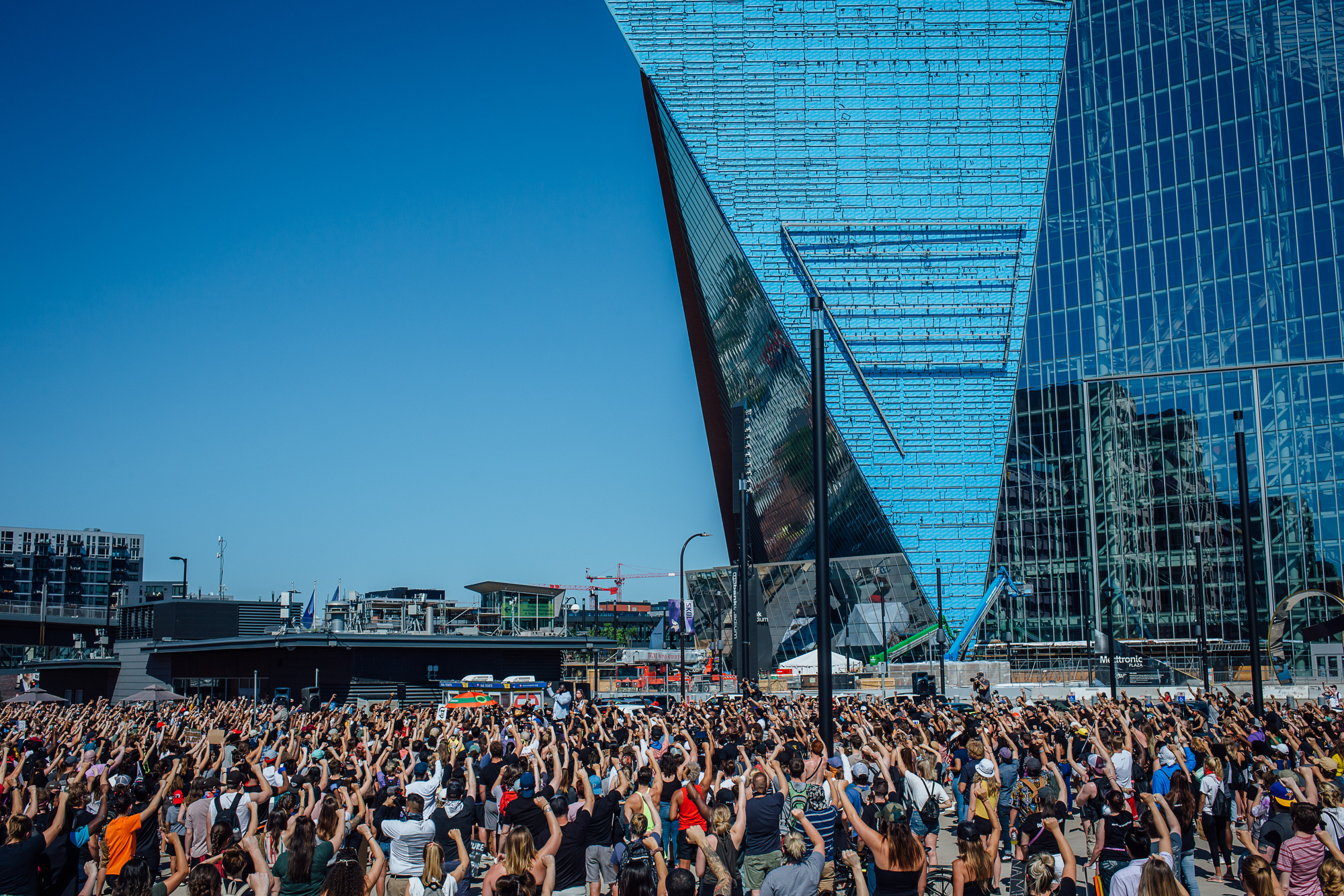 Manifestation en memoire de George Floyd et contre la violence policiere au pied du stade de football des Vikings de Minneapolis.