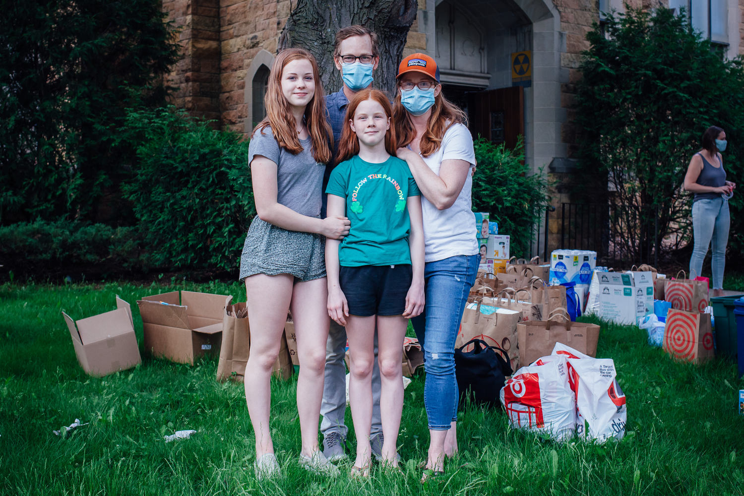 Le pasteur Micah Witham et sa famille, sa femme Laura et ses filles Dahlia, 13 ans, et Linden, 12 ans, lors d’une ceremonie hommage a George Floyd à Minneapolis.