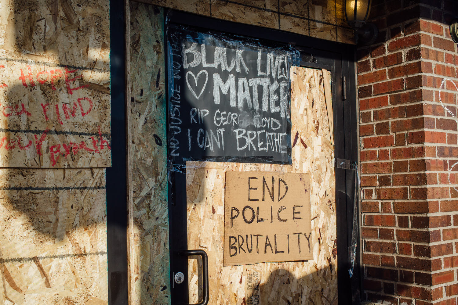 Vitres brisees lors d’une emeute a quelques coins de rue du poste de police ou etait affecte Derek Chauvin, le policier blanc qui a tue George Floyd. Reportage a Minneapolis, une semaine apres la mort de George Floyd. -