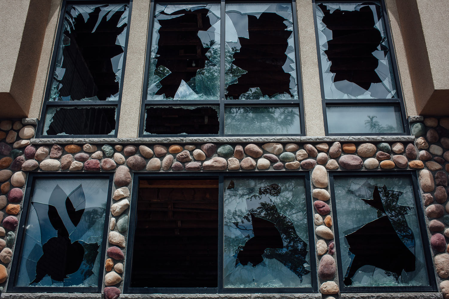 Vitres brisees lors d’une emeute a quelques coins de rue du poste de police ou etait affecte Derek Chauvin, le policier blanc qui a tue George Floyd. Reportage a Minneapolis, une semaine apres la mort de George Floyd.