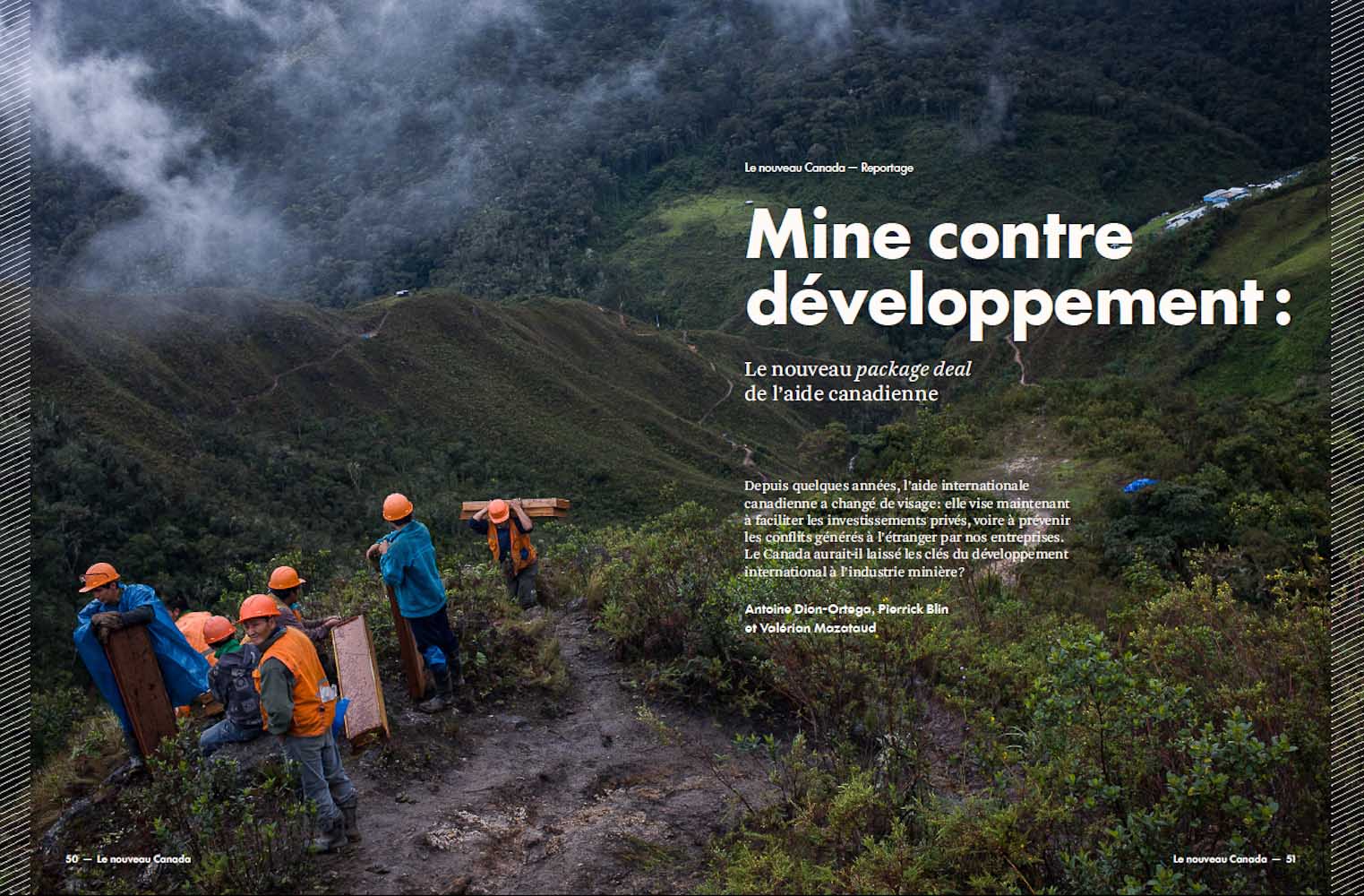 Pérou. 8 mars 2013. Vue aérienne du camp d’exploration de Cañariaco Norte. Afin de soigner ses relations avec la population, l’entreprise canadienne Candente Copper mise sur son programme de « développement durable », qui favorise les échanges commerciaux avec les habitants. « Au Pérou, l’acceptation sociale est la chose la plus difficile à obtenir. C’est un travail de tous les jours », admet James Armstrong, responsable du programme. – Peru, 8 march 2013. Peruvian employees of the Canadian mining company Candente Copper are carrying tools for exploratory drilling in the Cañariaco Norte exploration camp. To soften relations with the locals, the canadian company has implemented a sustainable development program, focusing among other things on commercial exchanges with locals, and agricultural development programs. «In Peru, social acceptability is the hardest thing to obtain. It’s an everyday’s job», concedes James Armstrong, in charge of the program. Valérian Mazataud | Hans Lucas -