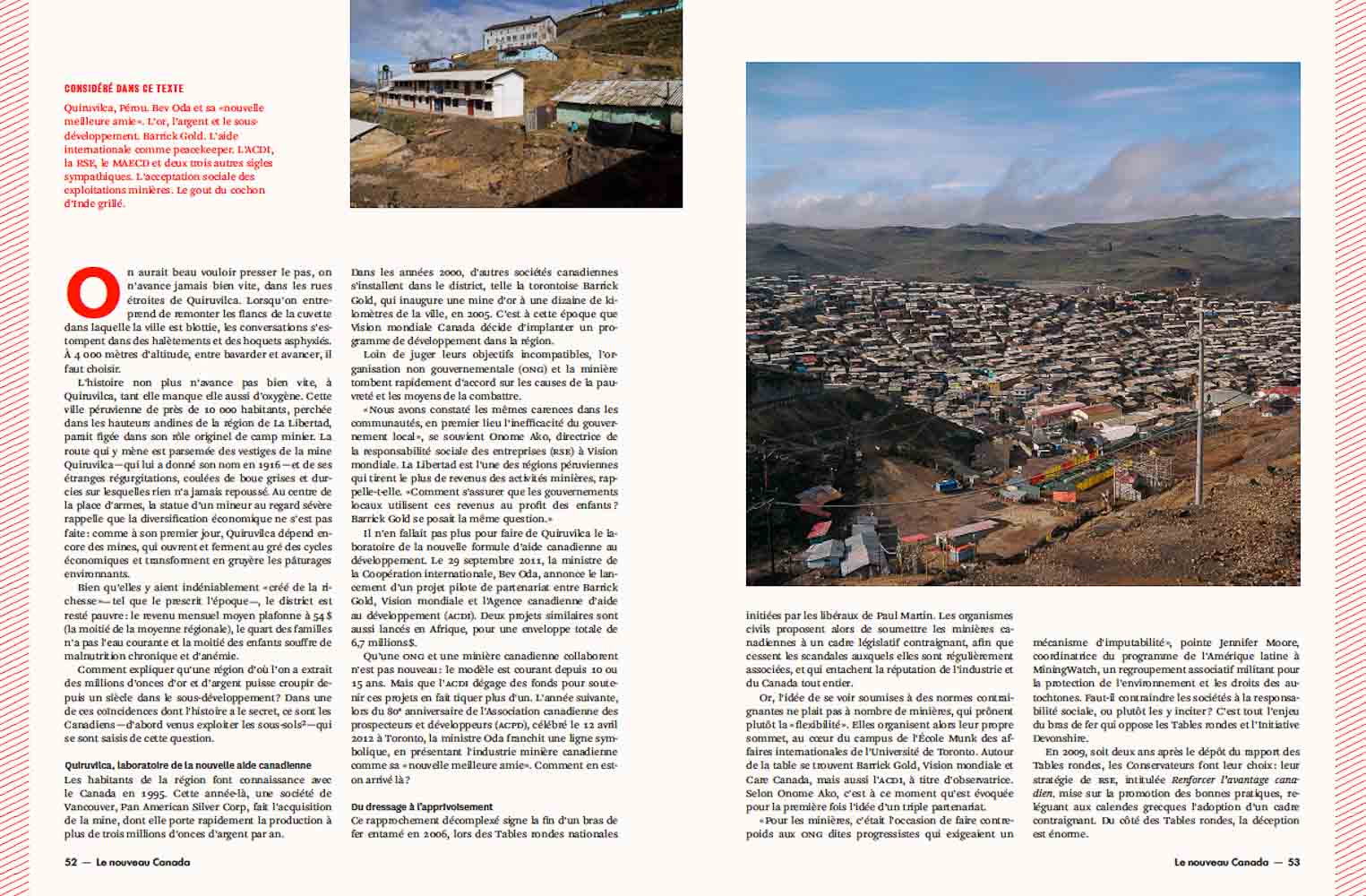 Perou, 8 mars 2013. Le projet minier de Candente est située dans l’une des zones les plus inaccessible du Pérou, à peu près 100 km à l’intérieur des côtes depuis la ville de Chiclayo, dans le Nord du pays, dans la région de Lambayeque. Le camp d’exploration est installé au fond de la vallée à pic de la rivière Cañarico. La principale route d’accès s’arrête au sommet. L’accès au camp s’effectue par une piste boueuse où seuls se risquent les pick-ups. L’entreprise a été la première à construire des routes dans la région qui permettent aux habitants de voyager plus facilement pour vendre leurs produits au marché. – Peru, 8 march 2013. Candente’s project is located in one of the toughest parts of Peru to reach. It is located about 100 km inland from the coastal city of Chiclayo, in the northern region of Lambayeque. The camp stands at the bottom of Cañarico River valley, whose walls are seem near-vertical. The main road stops at the top. Access to the camp is through a muddy, rutted trail that only pickups can risk. The company was the first to construct some of the roads, which now allow locals to travel more easily and start selling their products. Valérian Mazataud | Hans Lucas