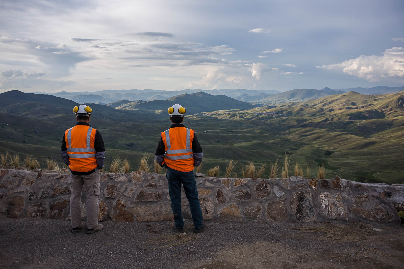 Pérou. 19 mars 2013. Dans le sud du Pérou, deux gestionnaires de la société canadienne HudBay Minerals contemplent le futur site de la mine de cuivre Constancia. Dans quelques années, ce paysage aura complètement changé. À gauche, une fosse de 300 m éventrera la montagne. À droite, deux vallées seront entièrement comblées par la halde à stériles et les résidus de cette mine. – Peru, 19 march 2013. In the South of Peru, two managers from canadian mining company HudBay Minerals watch over the future site of copper mine Constancia. In a few years, this landscape will be completely transformed. On the left, a 300 m deep pit will dig through the mountain. On the right, two of the valleys will be completely filled in with sterile rubbles from the mine. Valérian Mazataud | Hans Lucas -