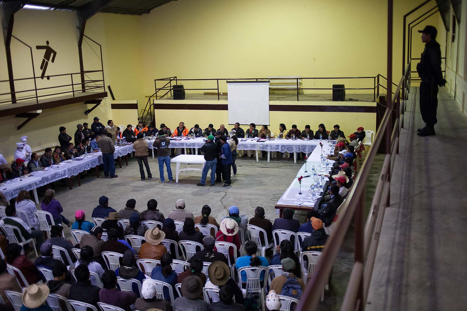 Quiruvilca, Pérou. 5 mars 2013. Après une série de forages exploratoires, des habitants ont soupçonné Barrick Gold de vouloir étendre ses activités à une zone située en bordure de plusieurs lacs, dont ils dépendent pour l’élevage et la pêche. En guise de protestation, une centaine de personnes ont bloqué l’accès au site en février 2013, empêchant ainsi la mine de fonctionner durant plusieurs jours. Afin de regagner la confiance des résidants, des représentants de Barrick Gold ont participé, en mars 2013, à une table de négociation pour renouer le dialogue avec les maires opposés au projet d’expansion — un signe d’ouverture destiné à éviter les conflits. « Nous voulons tous la même chose, compagnons : préserver les lacs de la région », a lancé le gérant de la mine devant une foule sceptique. – Quiruvilca, Peru, 5 march 2013. After the exploratory drillings on Laguna Sur and a blockade of the mine by local opposition groups, canadian company Barrick Gold has to regain the confidence of the population. In march 2013, a dialog round table was organized in Quiruvilca, with local authorities, local NGO, as well as representatives of Barrick Gold. Valérian Mazataud | Hans Lucas