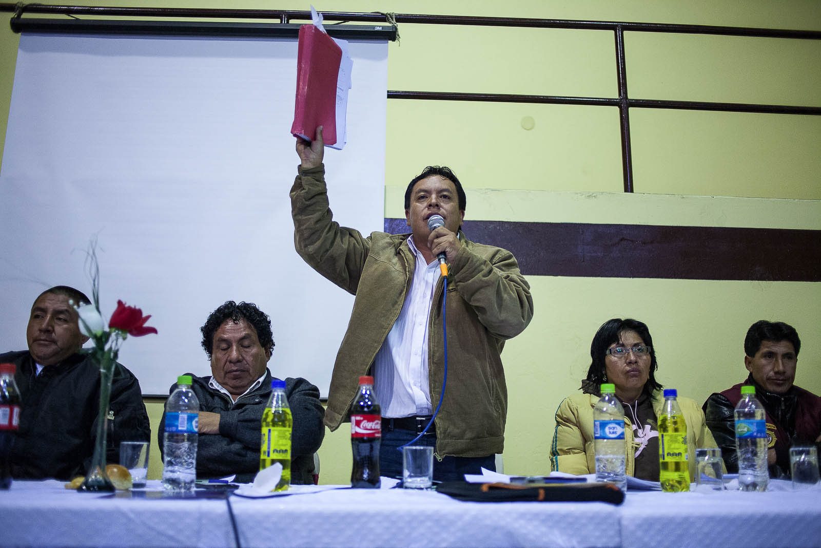 Quiruvilca, Pérou. 5 mars 2013. Juan Gabriel Alipio maire de Santiago de Chuco, une ville voisine de Quiruvilca. Après une série de forages exploratoires, des habitants ont soupçonné Barrick Gold de vouloir étendre ses activités à une zone située en bordure de plusieurs lacs, dont ils dépendent pour l’élevage et la pêche. En guise de protestation, une centaine de personnes ont bloqué l’accès au site en février 2013, empêchant ainsi la mine de fonctionner durant plusieurs jours. Afin de regagner la confiance des résidants, des représentants de Barrick Gold ont participé, en mars 2013, à une table de négociation pour renouer le dialogue avec les maires opposés au projet d’expansion. – Quiruvilca, Peru, 5 march 2013. Juan Gabriel Alipio mayor of Santiago de Chuco, a neighbouring town to Quiruvilca, opposed to the exploratory drillings in Laguna Sur. After the exploratory drillings on Laguna Sur and a blockade of the mine by local opposition groups, canadian company Barrick Gold has to regain the confidence of the population. In march 2013, a dialog round table was organized in Quiruvilca, with local authorities, local NGO, as well as representatives of Barrick Gold. Valérian Mazataud | Hans Lucas