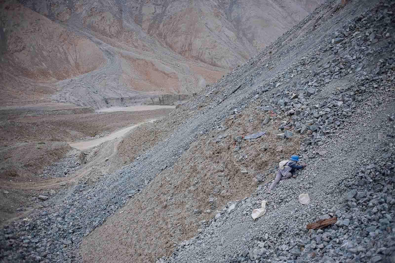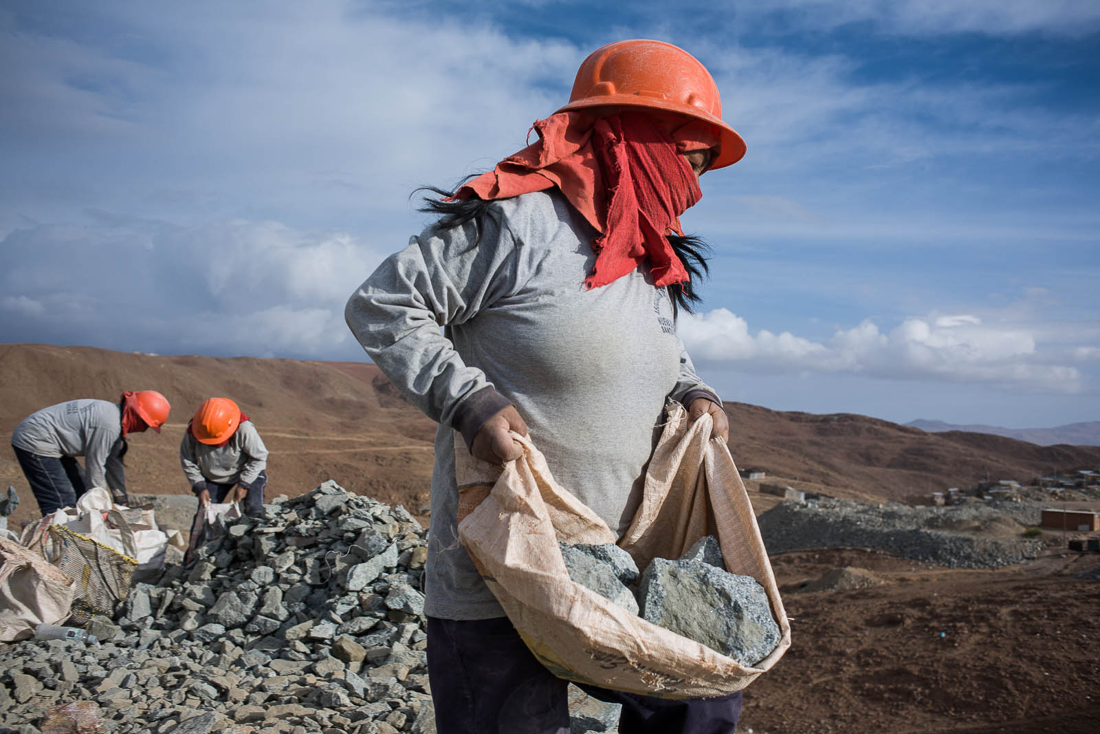 Cuatro Horas, Pérou. 16 mars 2013. Au petit matin, une «palaquera» (trieuse de roche), travaille à flanc de montagne dans la pile de minerais stériles rejetés par la mine de Cuatro Horas. Souvent originaires des zones agricoles pauvres, la plupart des palaqueras ont rejoint leur mari, mineur à la coopérative. Malheureusement, les occasions d’emplois sont rares ici. C’est que les femmes ne sont pas admises dans les mines : on croit qu’elles attirent le mauvais sort. Si elles veulent intégrer l’industrie minière, les femmes doivent se contenter des piles de stériles, malgré les faibles quantités de minerai que contiennent celles-ci. La mine est désormais en processus pour acquérir sa certification équitable. – Cuatro Horas, Peru, 16 march 2013. A Palaquera (in charge of sorting out the rubble) works at dawn on the slopes lying under the cooperative mine Macdesa in Cuatro Horas, Peru. Women are not allowed inside the mine, for fear the mine, a female in the popular beliefs, would be jealous. Women living on the mine site, often sisters or wives of miners, have to work as palaqueras, sorting out through the sterile rubbles rejected by the mine, in hope they can find some leftovers mineral traces such as gold or copper. The mine is in the process of getting its fair-trade certification. Valérian Mazataud | Hans Lucas