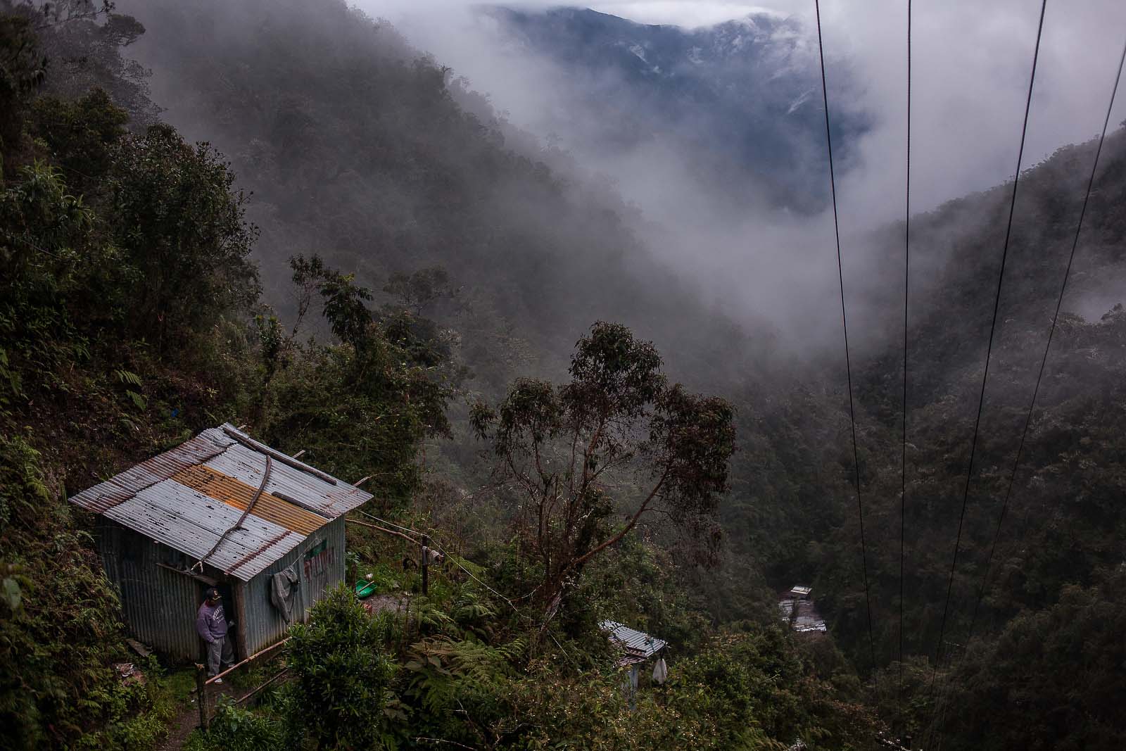 Cotapata, Bolivie. 26 mars 2013. À une heure au Nord-Est de La Paz, capitale de la Bolivie, la mine de Cotapata est l’une des trois mines d’or exploitée au coeur du parc national du même nom, d’une superficie de 40000 hectares et dont les sommets dépassent les 5000 mètres.. À droite, le câble du téléphérique, seule manière de transporter minerai et équipement depuis le fond de la vallée. – Cotapata, Bolivia, 26 march 2013. One hour to the North-East of La Paz, Bolivia’s capital, the mine of Cotapata is one of the three gold mines exploited within the Cotapata natural park, 40000 hectares wide and with mountaintops reaching more than 5000 meters. On the right of the picture, the cable for the lift, only way to carry equipment and ore between the top and the bottom of the deep valley where the mine is located. Valérian Mazataud | Hans Lucas -
