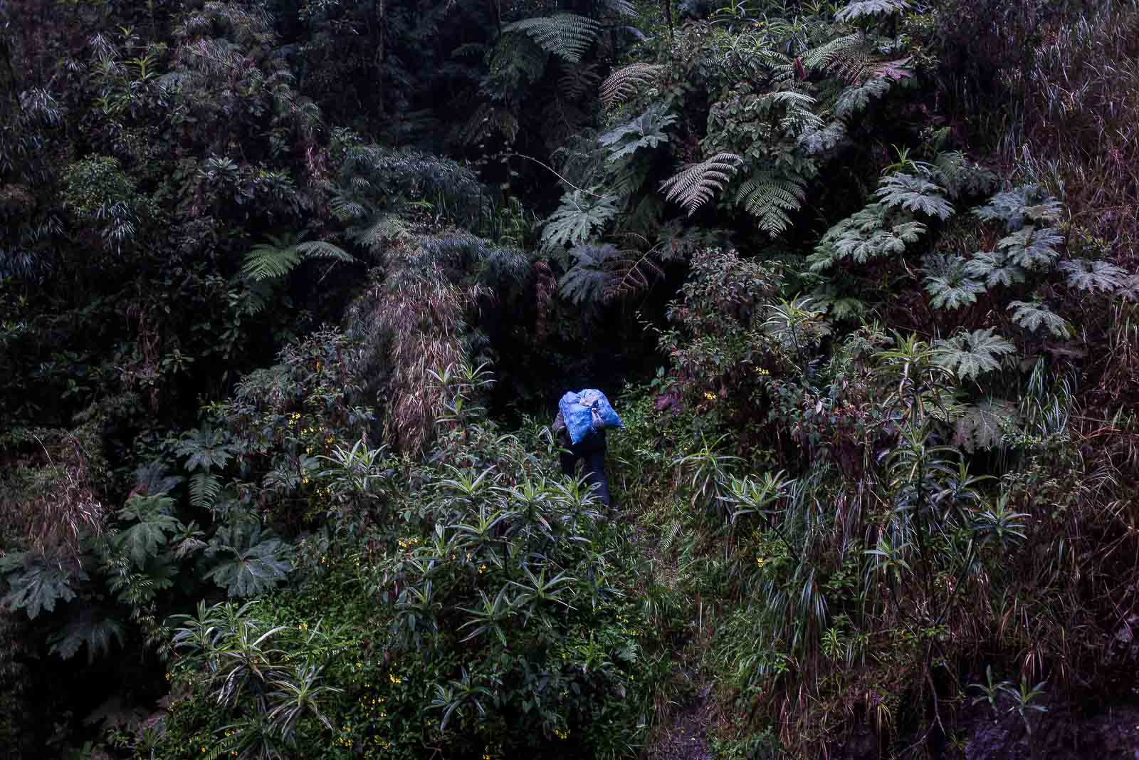 Cotapata, Bolivie. 26 mars 2013. Un mineur informel s’enfonce dans la forêt proche de la mine de Cotapata. Il y restera plus d’une semaine, creusant et broyant la roche lui même pour en extraire l’or. Les mineurs de la coopérative le tolère car il était présent avant le début de celle-ci. D’ici 2014, le gouvernement bolivien souhaite réglementer toutes les exploitations minières illégales. – Cotapata, Bolivia, 26 march 2013. An illegal gold digger penetrate the dense forest of the Cotapata national park, where he will spend almost a week on his own, digging for gold ore and crushing it on the spot, before extracting it with mercury. Although its methods are much different and more damaging than the ones employed by the Cotapata cooperative, the miners tolerate him as he is a long time acquaintance. Valérian Mazataud | Hans Lucas