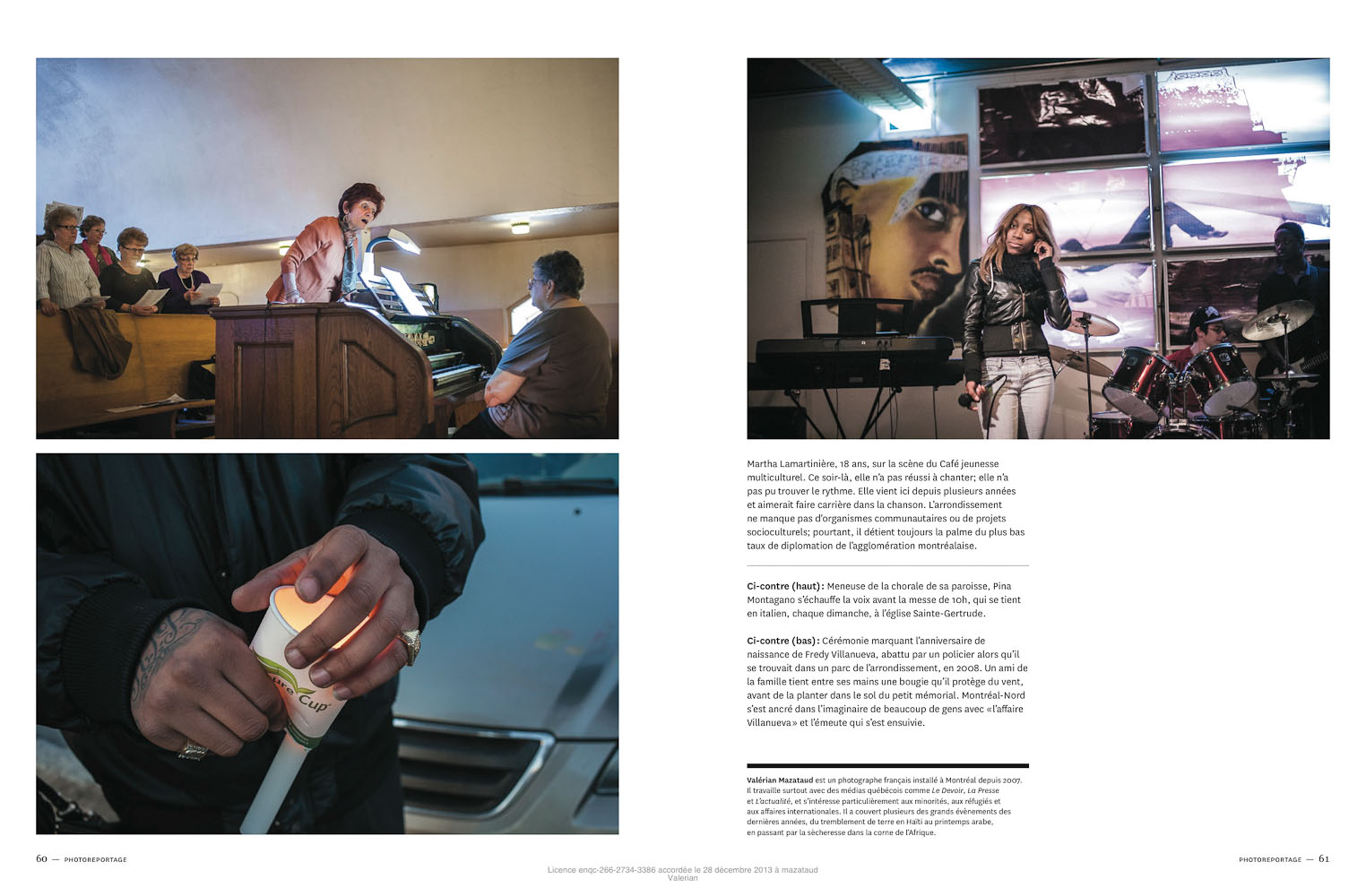Chang Lee «rappeur évangélique», ici en représentation au Café Souljazz. «Je garde la foi» clame le chanteur d’origine haïtienne, le doigt pointé vers la lumière blafarde d’un néon. La religion est très présente au quotidien à Montréal-Nord, même chez les jeunes. D’une vingtaine de lieux de culte au début des années 2000, on serait passé à plus de cent fin 2012 estime la mairie d’arrondissement, qui en a réglementé l’ouverture au printemps 2013. – Chang Lee, an evanlegical rapper, performs during the opening of a new community cafe in Montreal-Nord. «I keep the faith» claims the Haitian born singer as he points towards a neon light. Religion is an important part of daily life in Montreal-Nord. In 2000, the borough only counted twenty places of worship. In 2013, there was over a hundred and the council implemented a rule to control their opening more tightly. Valérian Mazataud | Hans Lucas -
