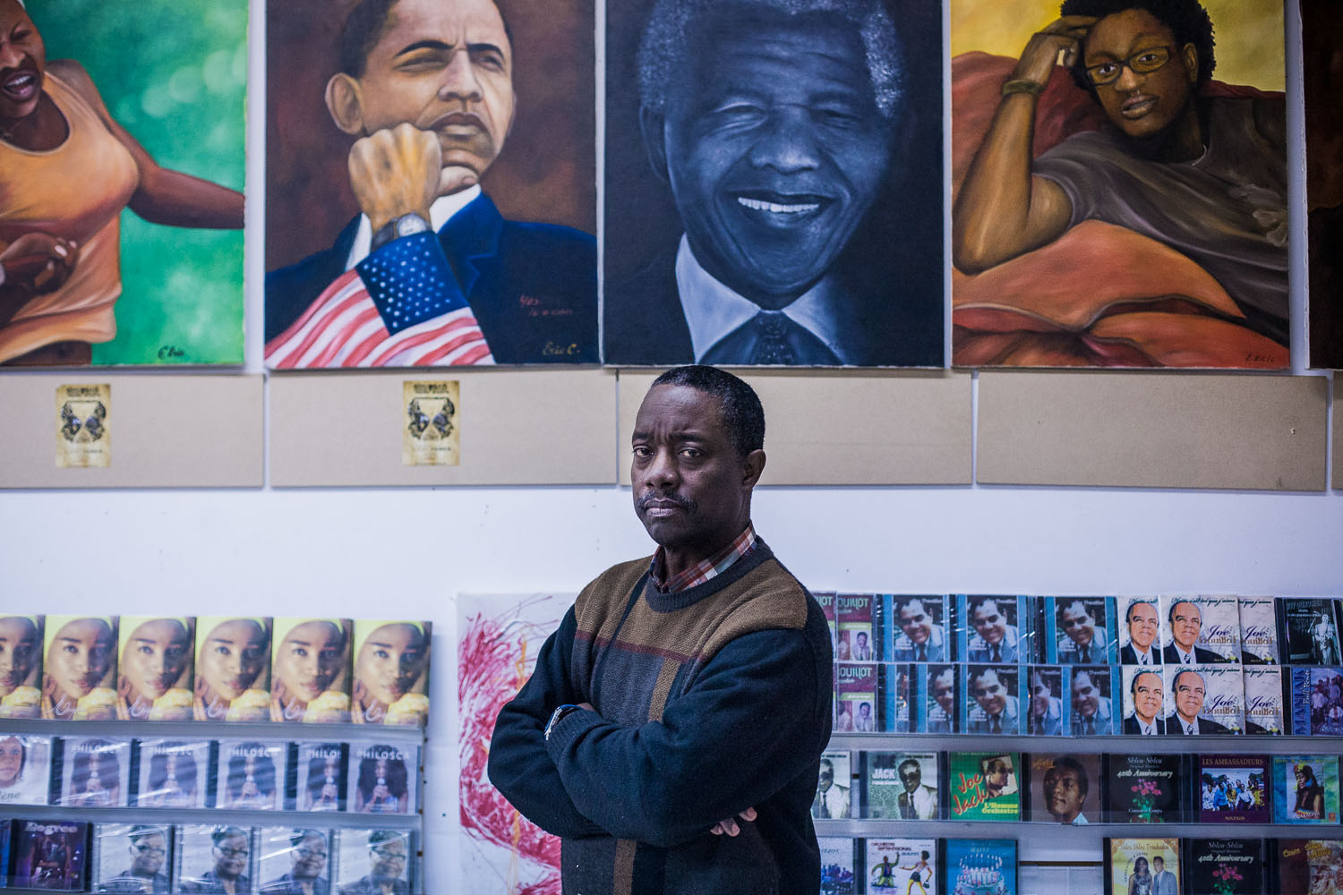 Eric Carrénard est un artiste peintre originaire d’Haiti. Il vend ses œuvres et celles des autres dans la petite boutique de l’association culturelle Haïti-Canada, sur le boulevard Henri Bourassa. Près de 120 000 québécois se déclarent d’origine ethnique haïtienne et 13% d’entre eux vivent à Montréal-Nord où il représentent 18% de la population. – Eric Carrenard is an Haitian born painter. He sells his works and other’s in the small shop of «association culturelle Haïti-Canada» on Henri Bourassa boulevard. 120.000 Quebecers define themselves as from Haitian ethnic background. 13% of them live in Montreal-Nord where they represent 18% of the population. Valérian Mazataud | Hans Lucas