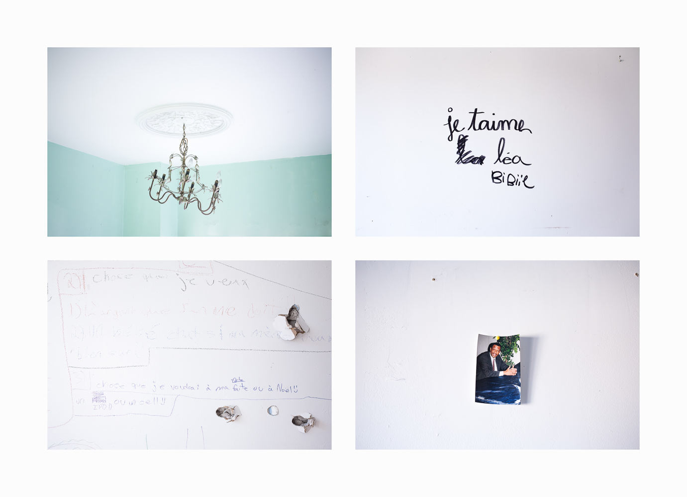 Décorations à l’intérieur de logements de la rue Lapierre avant les rénovations. La rue Lapierre est située dans le Nord-Est de Montréal-Nord, l’une des zones les plus pauvres de l’arrondissement. 41% des habitants y vivent sous le seuil de faible revenu. L’organisme Bâtir son quartier y a coordonné des rénovations pour le compte de la SHAPEM (Société d’Habitation Populaire de l’Est de Montréal). Durant les rénovations, les résidants ont du temporairement quitter les lieux, mais ont parfois laissé d’émouvantes traces de leur passage. – Decorations on the wall of an empty apartment on the Lapierre street, in the North-East of Montreal-Nord, where 41 % of inhabitants live under the low income cut-offs. Community group Batir son quartier (Build your neighbourhood) supervised buildings renovation for the SHAPEM (Society for people housing in the east of Montreal). Residents had to leave their apartments during renovations. Valérian Mazataud | Hans Lucas