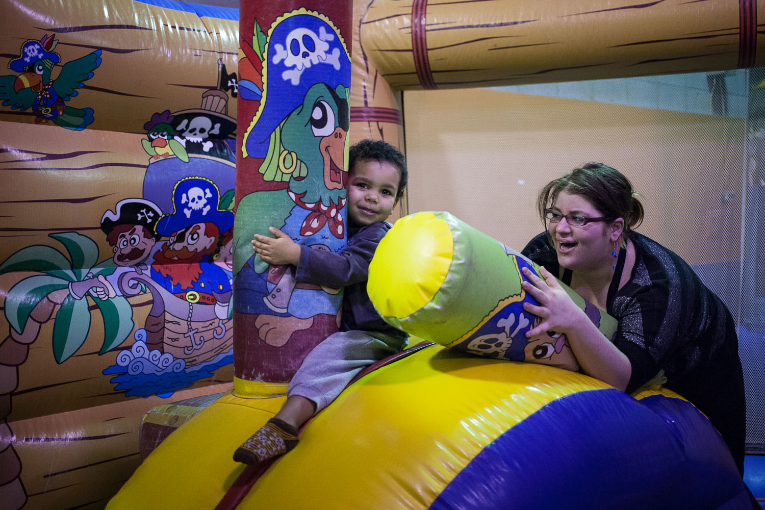 Joannie Lalonde et Andrew dans les jeux gonflables du Cégep Marie-Victorin. Ses premiers pas de mère au Rayon de Soleil n’ont pas été des plus faciles. «Les six premiers mois avec mon fils, je n’étais pas capable de m’alimenter ni capable de m’occuper de mon appartement». C’est grâce à l’aide des autres mères du Rayon de soleil et à la garderie intégrée au bâtiment qu’elle a trouvé son rythme. — Joannie Lalonde and Andrew play in inflatable games at the Marie-Victorin college. Her first steps as a mother were not easy. «During the first six months with my son, I couldn’t feed myself or take care of the apartment.» She found her rhythm thanks to the other mums in the building and to the kindergarten, at the lower floor of the building. Valérian Mazataud | Hans Lucas