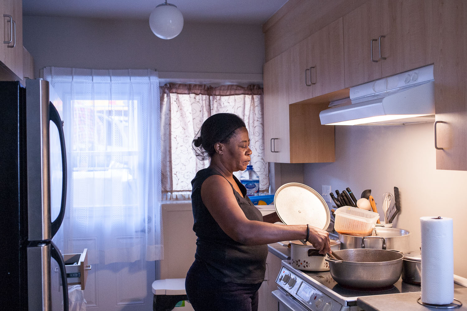 Julie Télémaque, 54 ans, cuisine dans l’un des appartements rénovés de la SHAPEM, qu’elle habite avec son conjoint. Tous deux sont originaires d’Haïti. «Je me sens beaucoup plus à l’aise ici. Surtout c’est beaucoup plus propre que notre ancien logement», avoue-t-elle. — Julie Telemaque, 54, cooks in a renovated apartment on Lapierre Street, in the north-east of Montreal-Nord, one of the poorest area of the borough. She lives her with her husband and both are originally from Haïti. In Montreal-Nord, 18% of the population has roots in Haïti. Valérian Mazataud | Hans Lucas