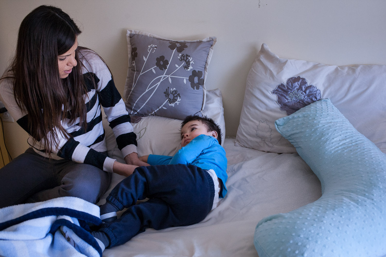 Ruth Perez, 22 ans, du Salvador, et son fils Manuel, 2 ans, vivent au Rayon de Soleil depuis le début de 2014. Ruth profite de son passage dans le foyer pour perfectionner son Français et terminer son école secondaire pour «ne pas travailler au Walmart toute sa vie». — Ruth, 22, is a refugee from Salvador. She lives with her son Manuel, 2 and studies French. Her aim is to finish her secondary school, so that she doesn’t have to «work in a Walmart her whole life». Valérian Mazataud | Hans Lucas