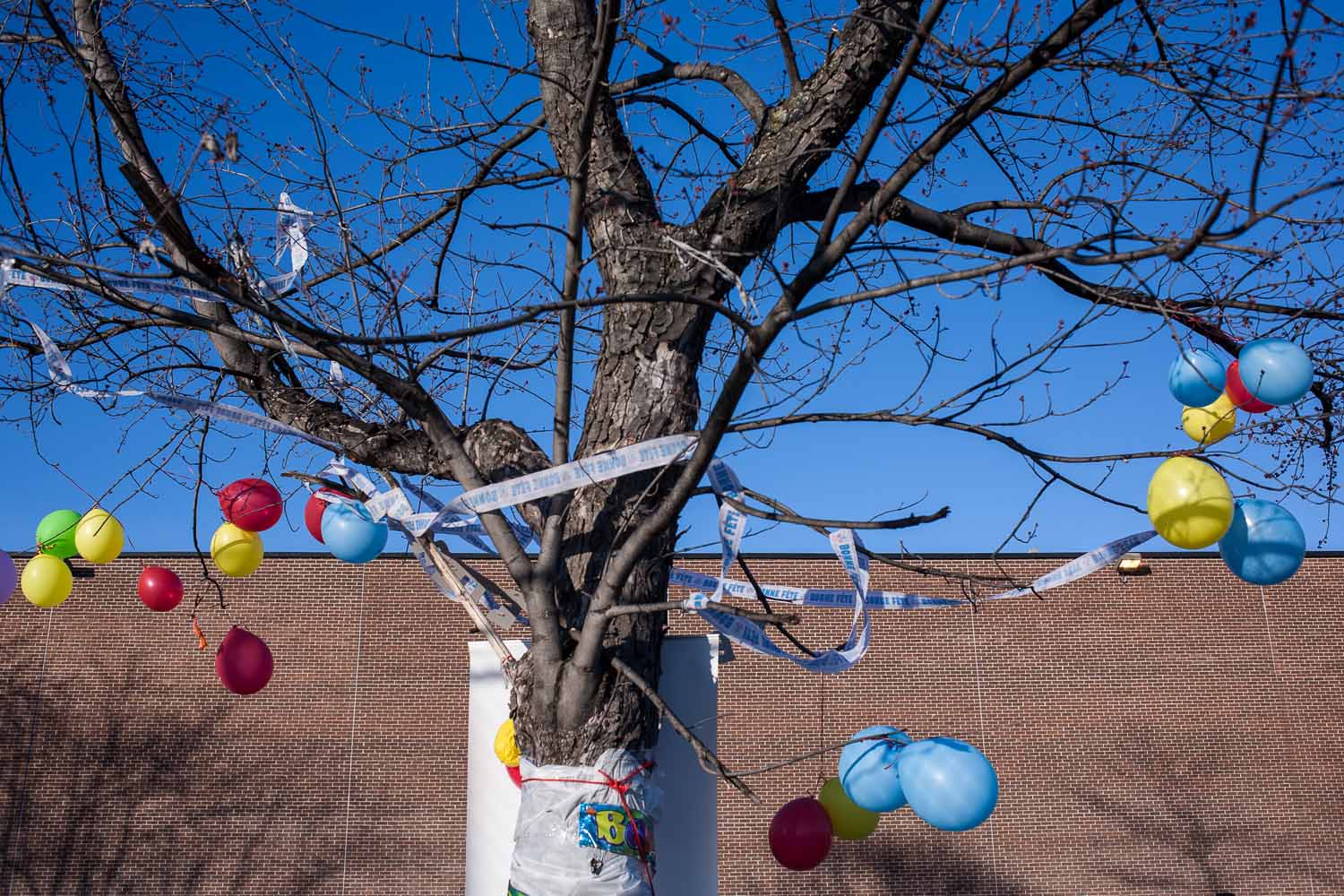 L’arbre qui sert de mémorial à Fredy Villanueva, photographié le jour de la célébration de l’anniversaire de naissance de ce dernier. Le 9 août 2008, Fredy Villanueva, 18 ans, était tué par un policier de la Ville de Montréal. L’accident a mis le feu aux poudres et à enclenché beaucoup de changements dans la vie du quartier. – The memorial tree for Fredy Villanueva, next to Parc Henri-Bourassa, where the 18 years old was shot. The day of the photograph ballons had been hanged to the branches to celebrate what would have been his 23rd birthday. The memorial artefacts have been removed a number of times. Valérian Mazataud | Hans Lucas