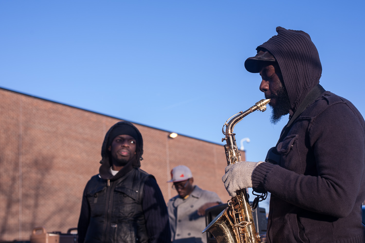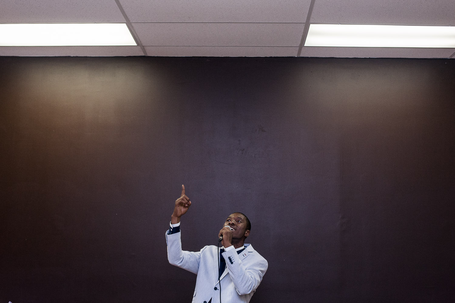 Chang Lee «rappeur évangélique», ici en représentation au Café Souljazz. «Je garde la foi» clame le chanteur d’origine haïtienne, le doigt pointé vers la lumière blafarde d’un néon. La religion est très présente au quotidien à Montréal-Nord, même chez les jeunes. D’une vingtaine de lieux de culte au début des années 2000, on serait passé à plus de cent fin 2012 estime la mairie d’arrondissement, qui en a réglementé l’ouverture au printemps 2013. – Chang Lee, an evanlegical rapper, performs during the opening of a new community cafe in Montreal-Nord. «I keep the faith» claims the Haitian born singer as he points towards a neon light. Religion is an important part of daily life in Montreal-Nord. In 2000, the borough only counted twenty places of worship. In 2013, there was over a hundred and the council implemented a rule to control their opening more tightly. Valérian Mazataud | Hans Lucas