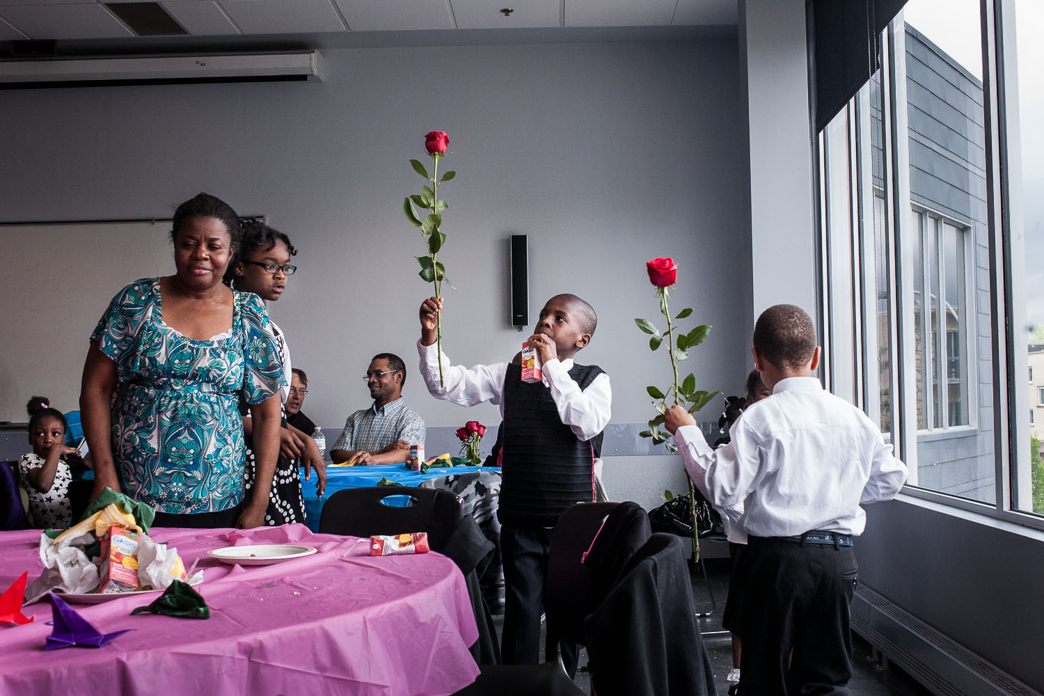 Réunion inter-religieuse et inter-générationnelle à la Maison culturelle et communautaire de Montréal-Nord, à l’occasion de la fête des mères. Les enfants de la chorale de l’Église du Nazaréen le Rocher des Siècles avaient pour tâche de distribuer les roses aux mamans présentes ce jour là. – An Inter-religion and inter-generation gathering at the Cultural and community house of Montreal-Nord, for mother’s day. Children from a Nazarene church choir distributed roses to all mothers present that day. Valérian Mazataud | Hans Lucas