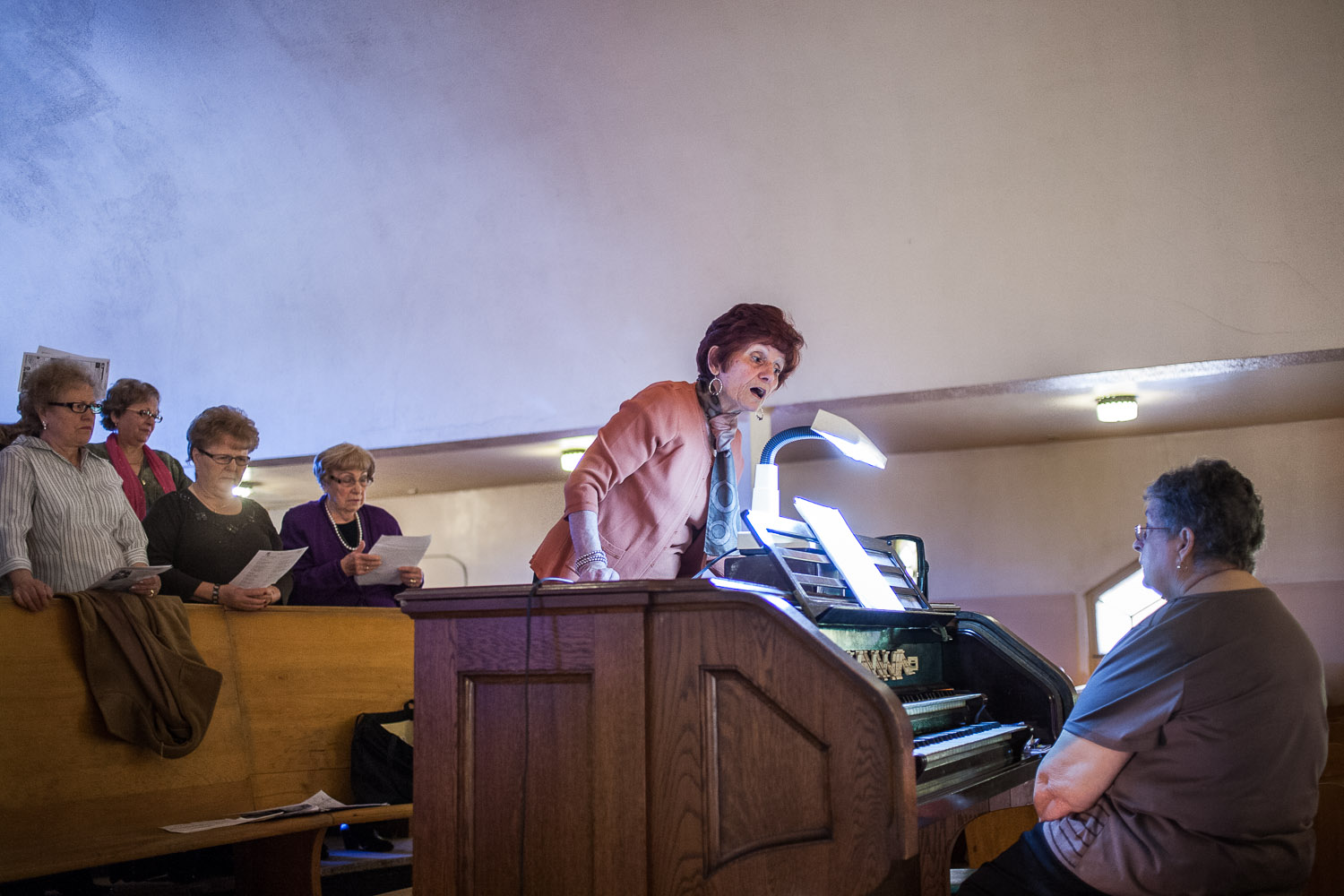 Pina Montagano, meneuse de la chorale italienne de Sainte-Gertrude, s’échauffe la voix avant la messe de dix heures qui se tient en Italien chaque dimanche à l’Église Sainte-Gertrude. Les Italiens font parti des communautés fondatrices de Montréal-Nord, qui ont transformé un village champêtre en ville. – Pina Montagano, who leads the Sainte-Gertrude Italian choir, warms-up her voice before the 10 AM italian sunday mass. Italians are among the founding communities of Montreal-Nord who transformed a rural village into an urban suburb. Rosa Goffredo, who arrived from Italia in 1952, remembers : «When we arrived, it was only new houses. We bought one. At the time, the whole street was Italian.» Valérian Mazataud | Hans Lucas -