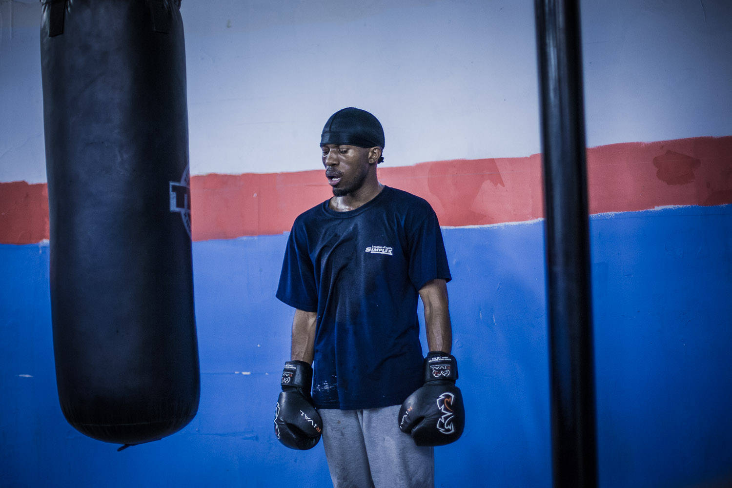 Le boxeur Darius à l’entrainement au Club de boxe l’Espoir, fondé par le policier du SPVM Evens Guercy, également détenteur d’un baccalauréat en sociologie, avec comme objectif de fournir une alternative à la délinquance juvénile. – Boxer Darius trains in Club de boxe l’Espoir (Hope boxing club). The club, founded by Evens Guercy, a Montreal police officer who owns a bachelor degree in sociology, aims at keeping local youth away from crime. Valérian Mazataud | Hans Lucas